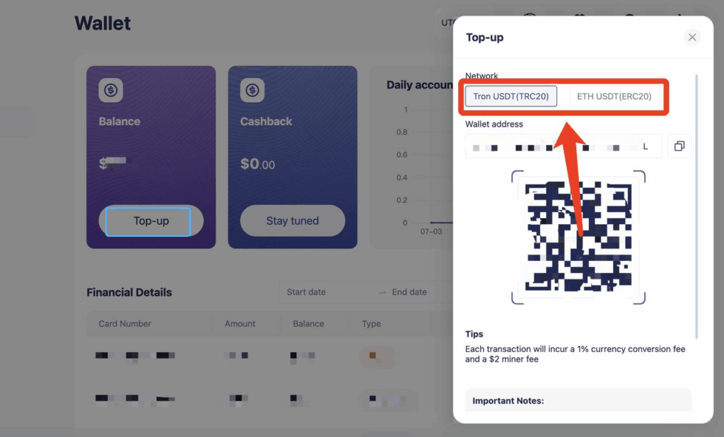 من خلال صفحة Wallet، اختر الشبكة (TRC20 أو ERC20) وأرسل USDT. انتظر حتى يظهر الرصيد.