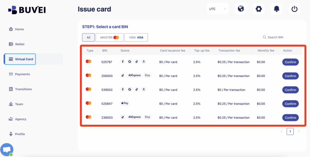 بعد توفر الرصيد، انتقل إلى صفحة Virtual Cards، واختر BIN المناسب للخدمة المطلوبة، ثم اضغط Confirm.