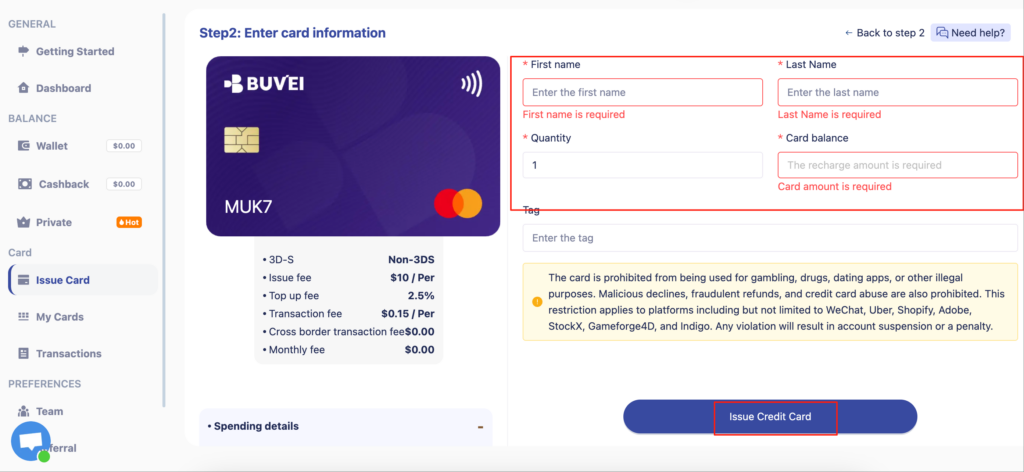 3. أدخل بيانات إنشاء البطاقة: