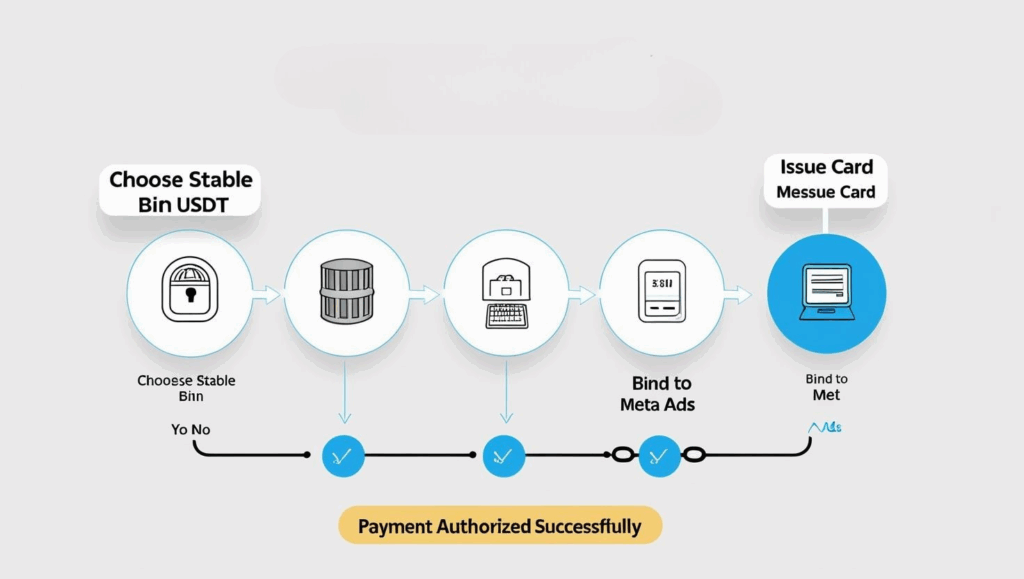 Meta 広告との互換性が高い Visa/Mastercard 発行のカードを選び、事前に十分な残高をチャージしましょう。Buvei は、Meta に最適化された複数の BIN を提供し、TRC20/USDT などのステーブルコインチャージに対応しています。