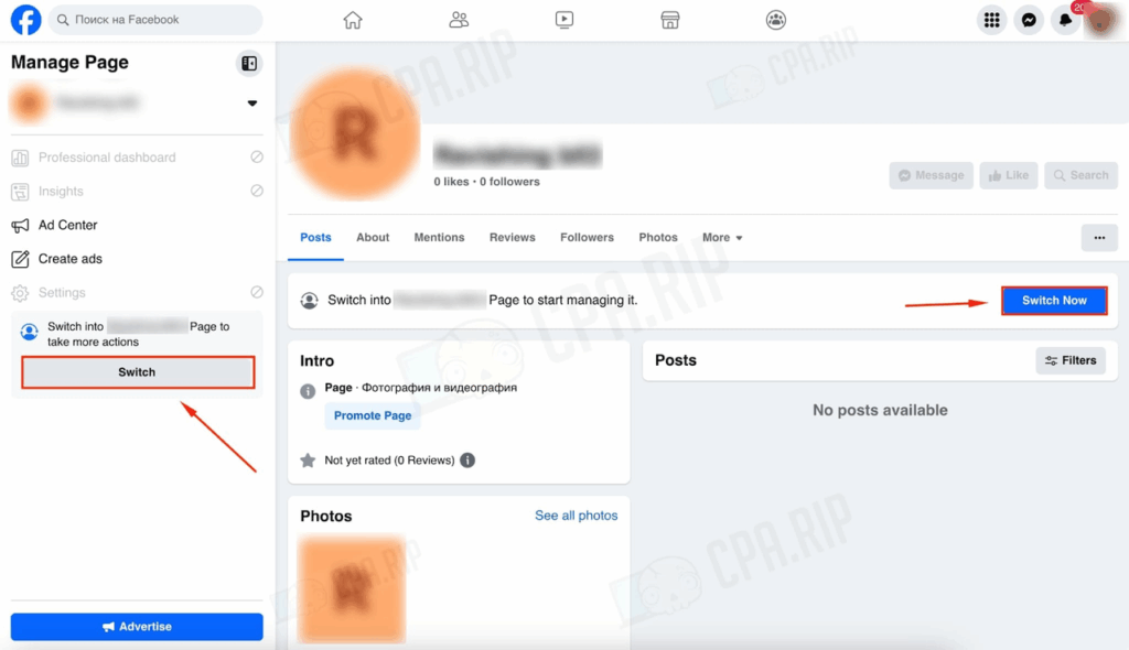 • 画面右上にある「切り替え」ボタンをクリックし、ページ管理者モードに変更してください。