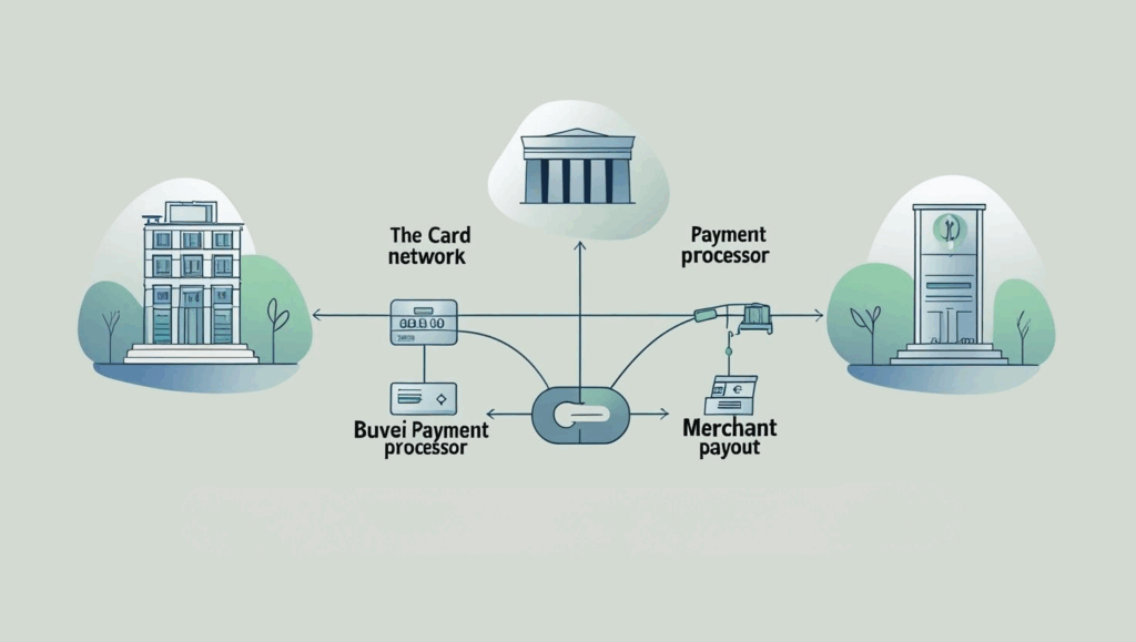 加盟店 → アクワイアラー → カードネットワーク(Visa/Mastercard)→ Buvei発行システム