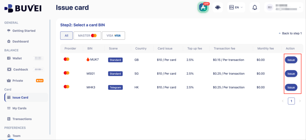 Log in to access the Buvei dashboard, where wallets and virtual cards are managed