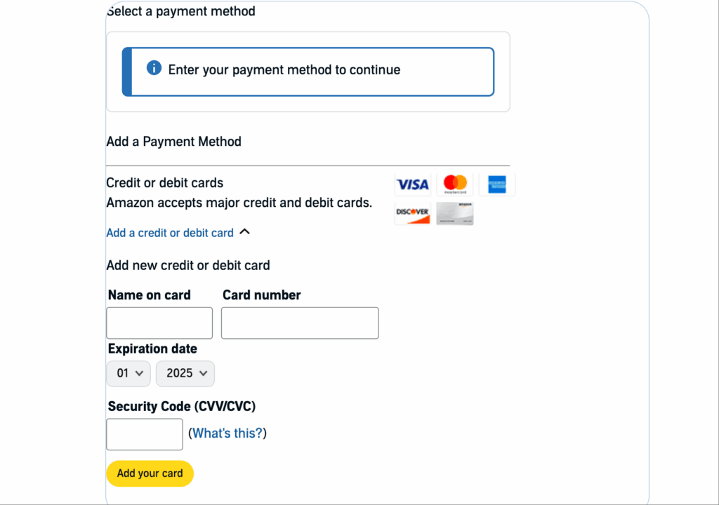• No método de pagamento, selecione “Adicionar cartão de crédito/débito”.