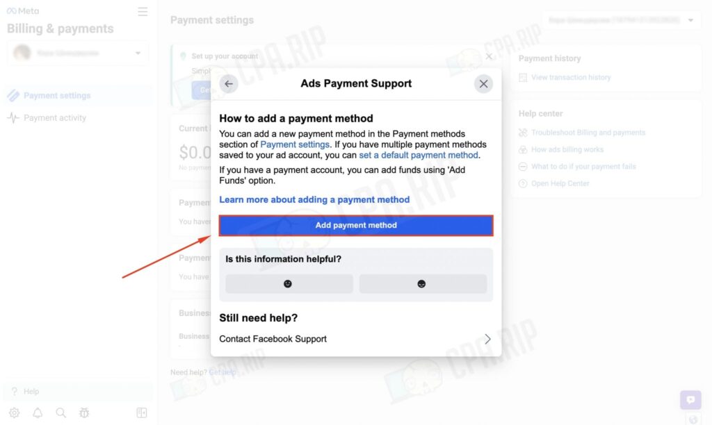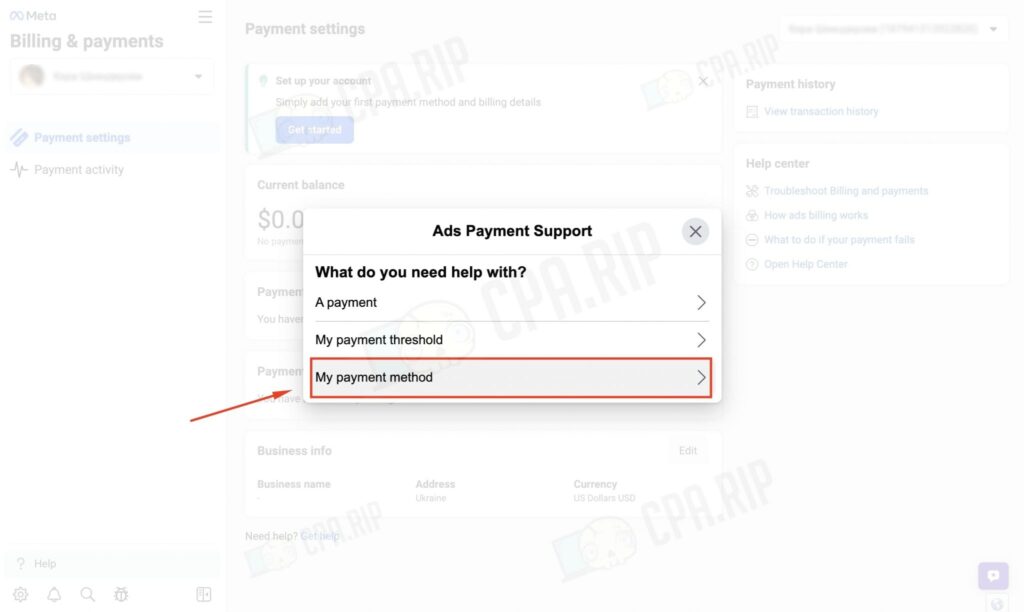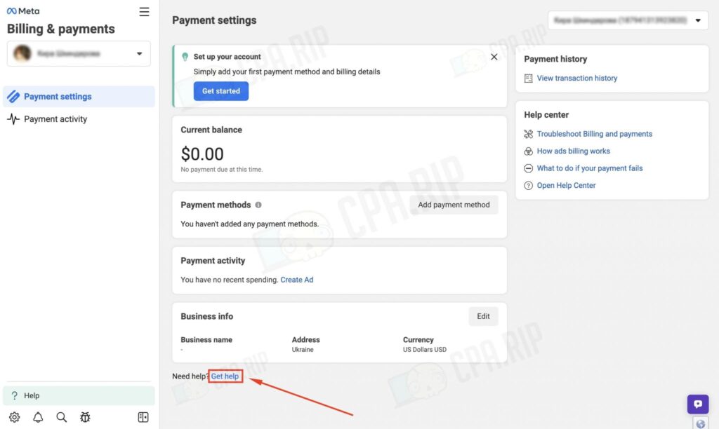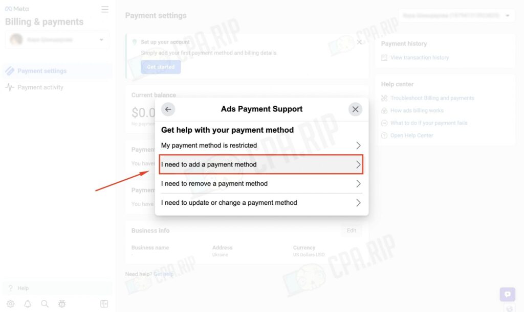 Натисніть «Отримати допомогу», далі виберіть «Мої платіжні методи».